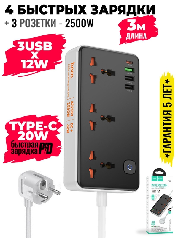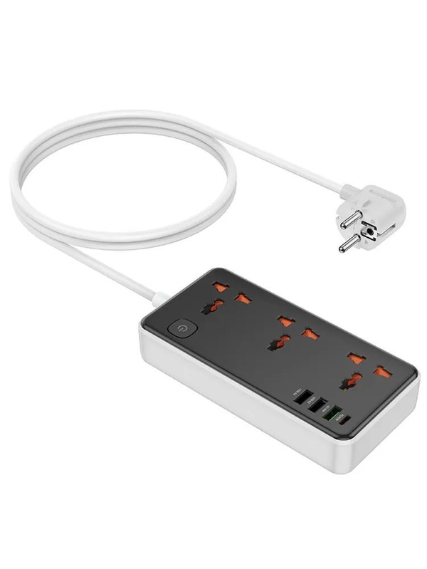 Сетевое зарядное устройство 3xUSB + USB Type-C + 3 розетки, 30 Вт Quick Charge 3.0/Power Delivery, 3 м, черный / Hoco AC8A