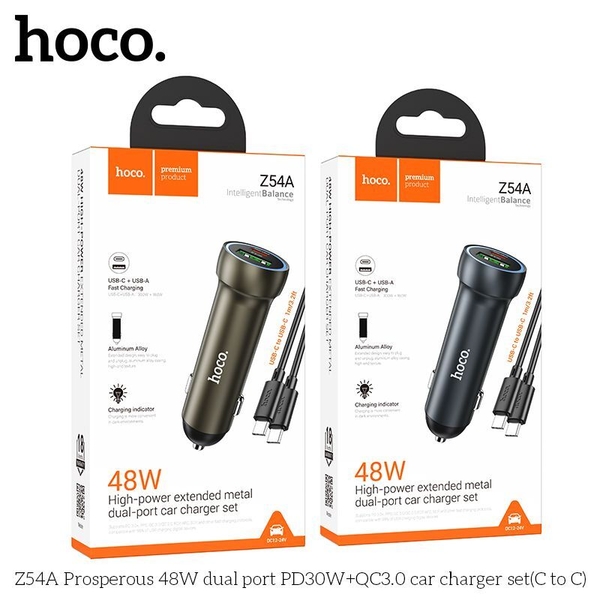 Автомобильный блок питания, HOCO Z54A, Prosperous, 1xUSB + 1xUSB-C, PD 48Вт, серый металлик